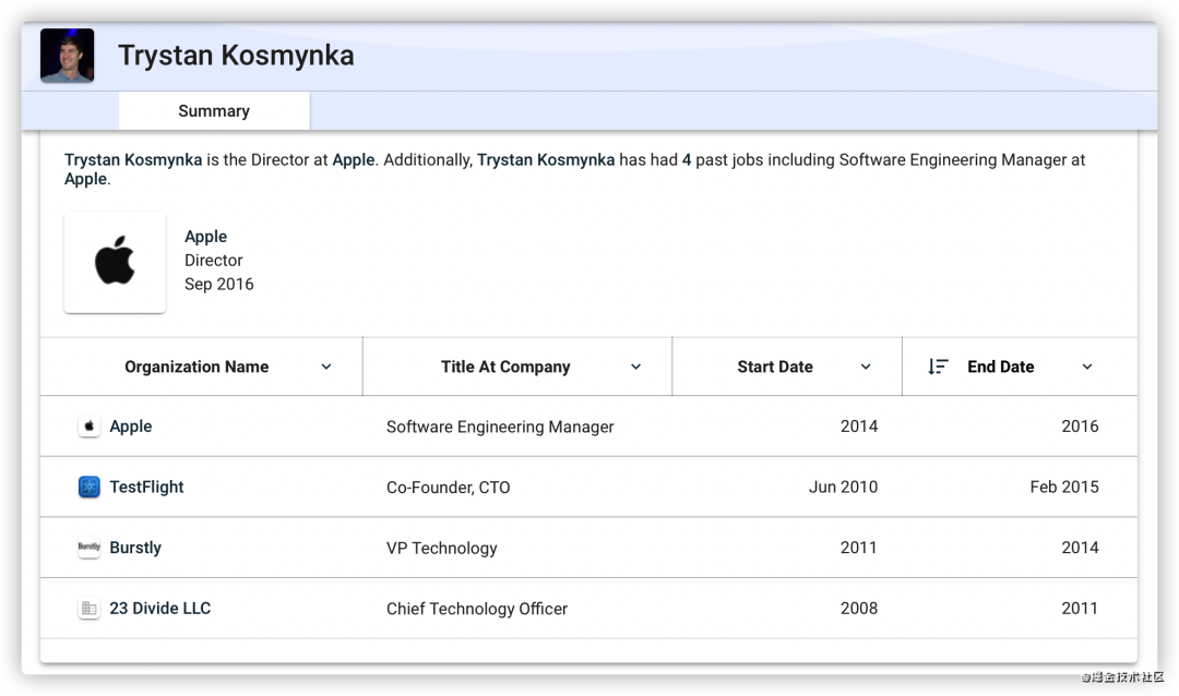 可能因为是苹果审核员保密协议,所以审核员很少有公开社交活动,网上能查到的资料也不多,在 Trystan Kosmynka - Crunchbase Person Profile 可以看到 Trystan Kosmynka 的职场经历: