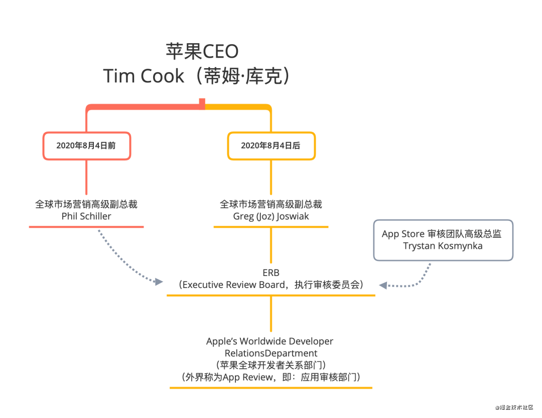 虽然目前执行审核委员会(ERB)的领导人已经更换为 Greg (Joz) Joswiak(格雷格·“乔兹”·乔斯维亚克),不过日常的应用审核管理应该还是由~~原来的全球开发者关系副总裁 Ron Okamoto(罗恩·冈本)~~和 App Store Review 总监 Trystan Kosmynka(特里斯坦·科斯明卡)负责。