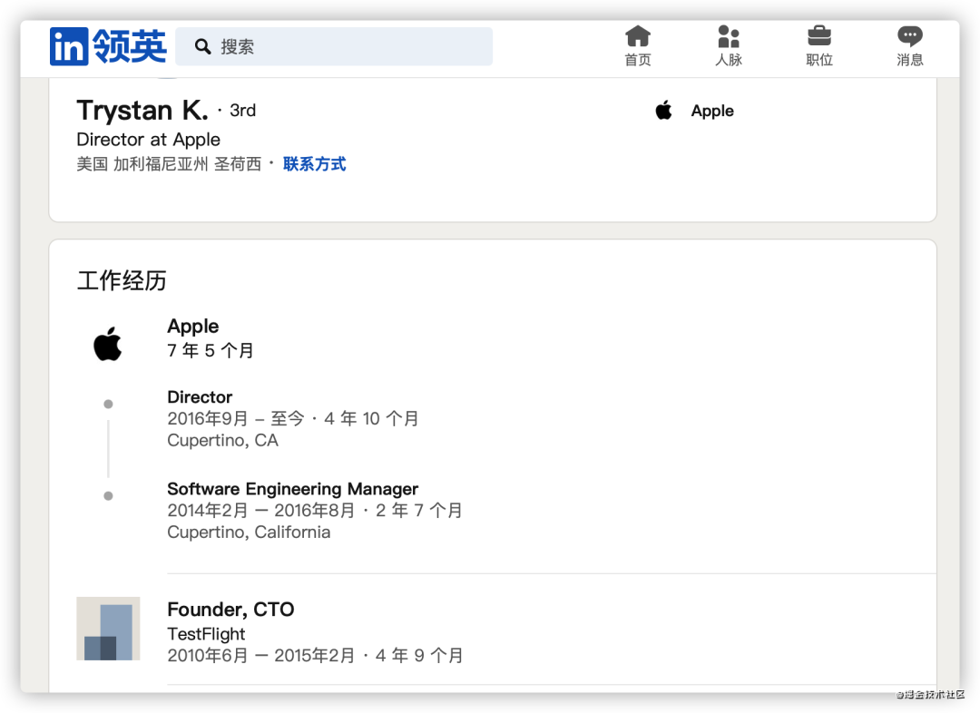 从这2张图片,大家有没有发现什么,这个兄弟的前一个公司和职位!没错!TestFlight 的创始人和CTO,苹果在2015年收购的公司,变成了如今的 TestFlight 测试工具!所以,也是技术大佬啊!膜拜~