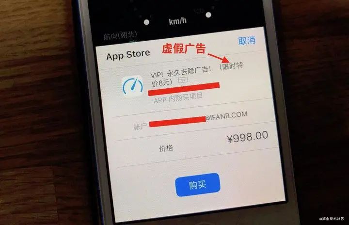 比如防不胜防的诱导内购,例如:应用内打出「限时特价 8 元」的虚假优惠,同时不断弹出内购项目的支付页面,如果不小心误触就会被扣去 998 元。引用来源:爱范儿
