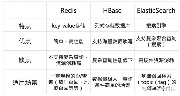 我们讲完了架构上一些思考点和具体架构实现方案,下面就是关于召回层具体技术选型问题。我们先回顾一下,在常用的推荐召回源中,有基于 topic ( tag )的召回、实体的召回、地域的召回、CF(协同过滤)的召回以及 NN 产生的 embedding 召回等等。那么为了能够支持这些召回,技术上我们应该如何来实现呢。我们先从使用角度看一下常用的 NoSQL 数据库产品,Redis 是典型的 k-v 存储,其简单、并且高性能使得其在业内得到大量使用,但不支持复杂查询的问题也让 Redis 在召回复杂场景下并不占优,因此一般主要适用于 kv 类的召回,比如热门召回,地域召回,少量的 CF 召回等等。而 HBase 作为海量数据的列式存储数据库,有一个明显缺点就是复杂查询性能差,因此一般适合数据查询量大,但查询简单的场景,比如推荐系统当中的已读已推等等场景。而 ES 其实已经不算是一个数据库了,而是一个通用搜索引擎范畴,其最大优点就是支持复杂聚合查询,因此将其用户通用基础检索,是一个相对适合的选择。