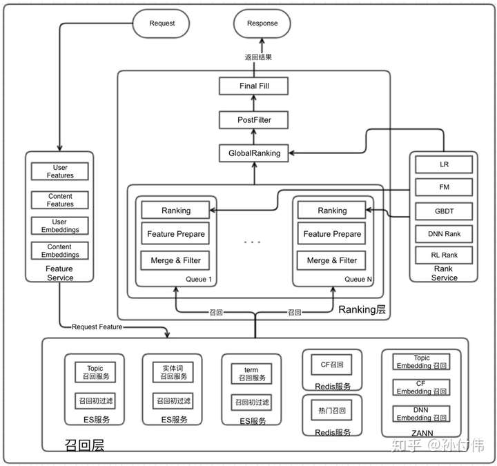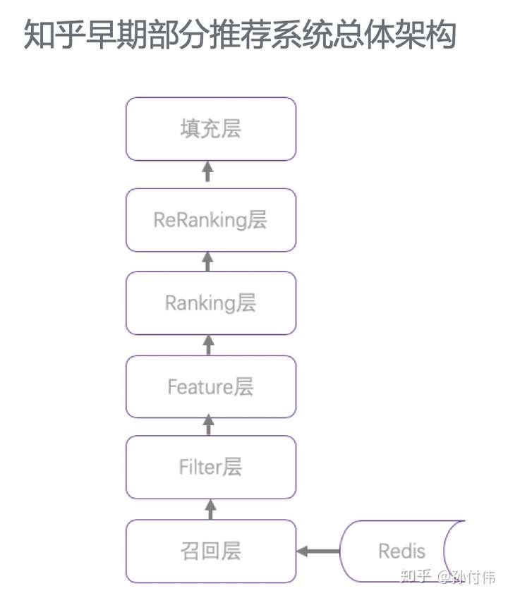 从我们知乎来说,也大体是这样一个发展路线,比如今年的7月份时,因为一些业务快速发展且架构上相对独立的历史原因,我们的推荐系统存在多套,并且架构相对简单。以其中一个推荐架构设计相对完善的系统为例,其总体架构是这样的。可以看出,这个架构已经包含了召回层和 ranking 层,并且还考虑了二次排序。