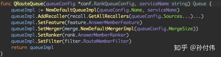 我们可以指定所需召回源,指定 merger 策略等等,当某个过程不需处理,会按自动默认步骤处理,这样在具体 queue 的实现中就可以通过如下简单操作进行自由配置。