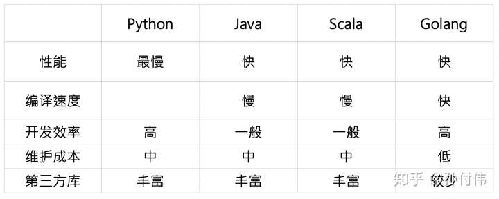 从性能上,依照公开的 benchmark,Golang 和 Java、Scala 大概在一个量级,是 Python 的 30 倍左右。其次 Golang 的编译速度较快,这点相对于 java、scala 具有比较明显的优势,再次其语言特性决定了Golang 的开发效率较高,此外因为缺乏 trycatch 机制,使得使用 Golang 开发时对异常处理思考较多,因此其上线之后维护成本相对较低。但 Golang 有个明显缺陷就是目前第三方库较少,特别跟 AI 相关的库。