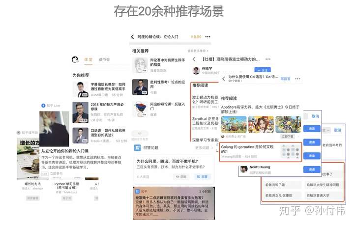因此,在链接人与知识的路径中,知乎存在着大量的推荐场景。粗略统计,目前除了首页推荐之外,我们已存在着 20 多种推荐场景;并且在业务快速发展中,不断有新的推荐业务需求加入。在这个背景之下,构建一个较通用的且便于业务接入的推荐系统就变成不得不做的事了。