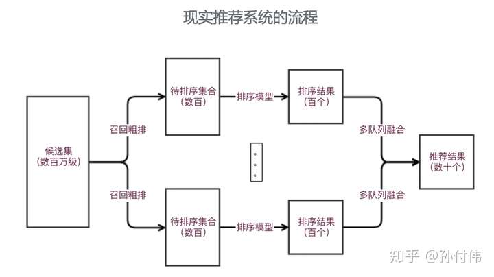 简单推荐模型适合一些推荐结果要求单一,只对单目标负责的推荐场景,比如新闻详情页推荐、文章推荐等等。但在现实中,作为通用的推荐系统来说,其需要考虑用户的多维度需求,比如用户的多样性需求、时效性需求、结果的满足性需求等。因此就需要在推荐过程中采用多个不同队列,针对不同需求进行排序,之后通过多队列融合策略,从而满足用户不同的需求。