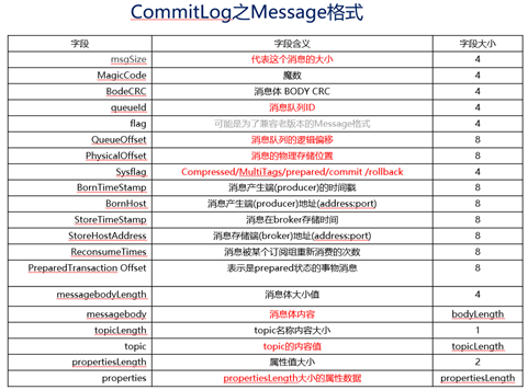 2.消息存储文件,所有消息主题的消息都存储在CommitLog文件中。每一条消息长度不同,消息体结构如下图