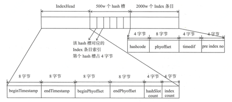 - 2.Hash 槽,一个 IndexFile 默认包含 500 万个 Hash 槽,每个 Hash 槽存储的是落在该Hash 槽的 hashcode 最新的 In dex 的索引 。
