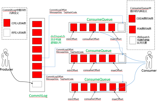 - 读的时候,通过构建的三个consumerQueue读取。consumerQueue存储索引数据,每个索引数据包含commitLogOffset、messageSize、tagHashCode三个属性。ConsumerQueue包含三个属性,maxOffset:消息落地后最大的偏移量、consumerOffset:消费者消费进度、minoffset:如果消息没有被清除过,为零。若被清除过,则是清楚后的偏移量值。