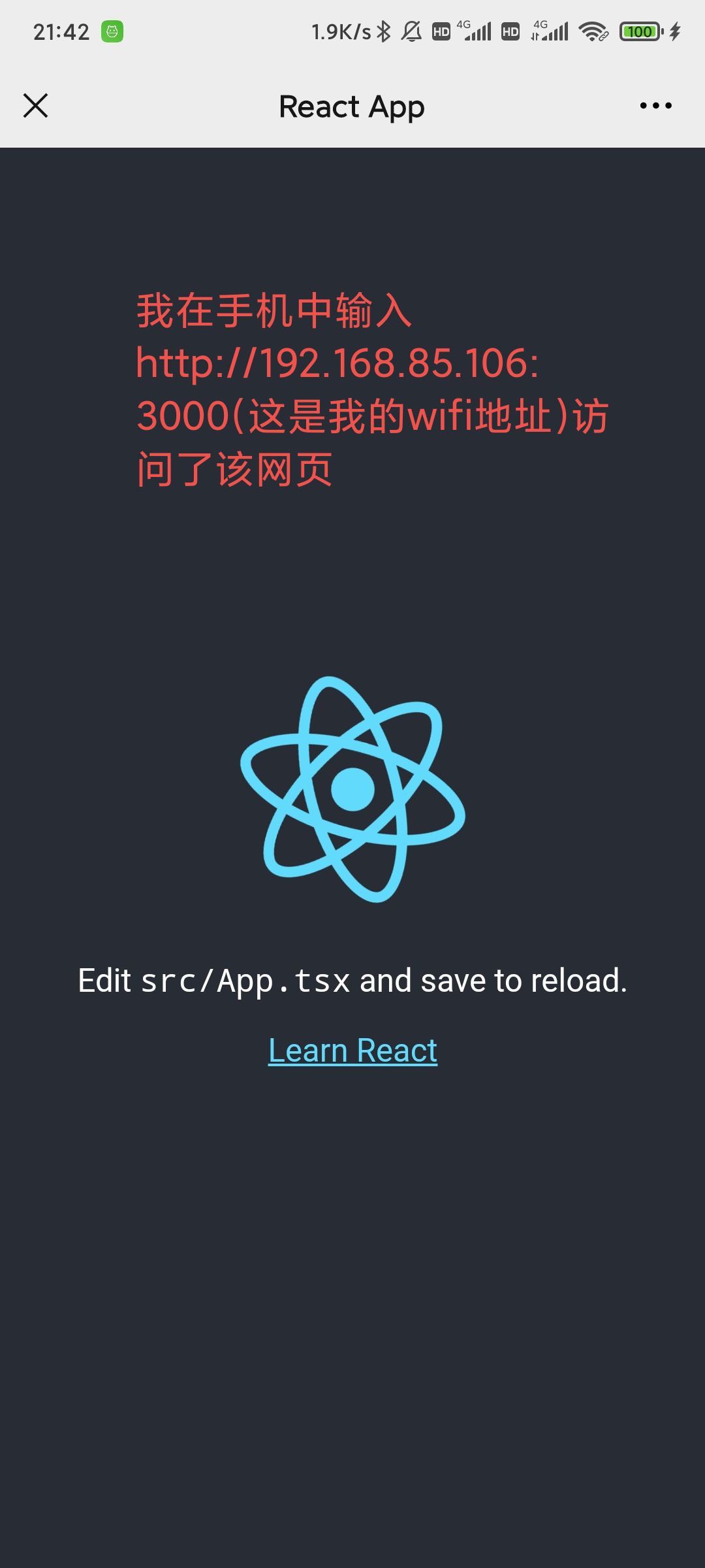 此时在命令行敲下npm run dev(请自行在package.json的script配置)启动服务,即可使用 WLAN 地址加端口号访问网页了!
