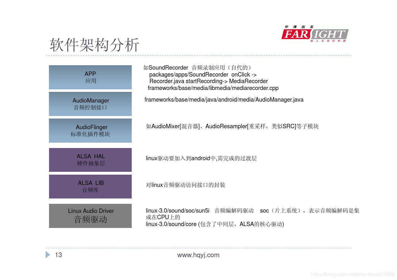 提供给应用的功能接口有:AudioTrack与AudioRecord两个类,分别是播放与录音的功能接口。这两个功能接口会通过AudioSystem调用AudioFlinger。AudioFlinger对管控着所有的Buf与播放,同时AudioFlinger也受AudioSystem管理,其中的管理策略来自于AudioPolicy.