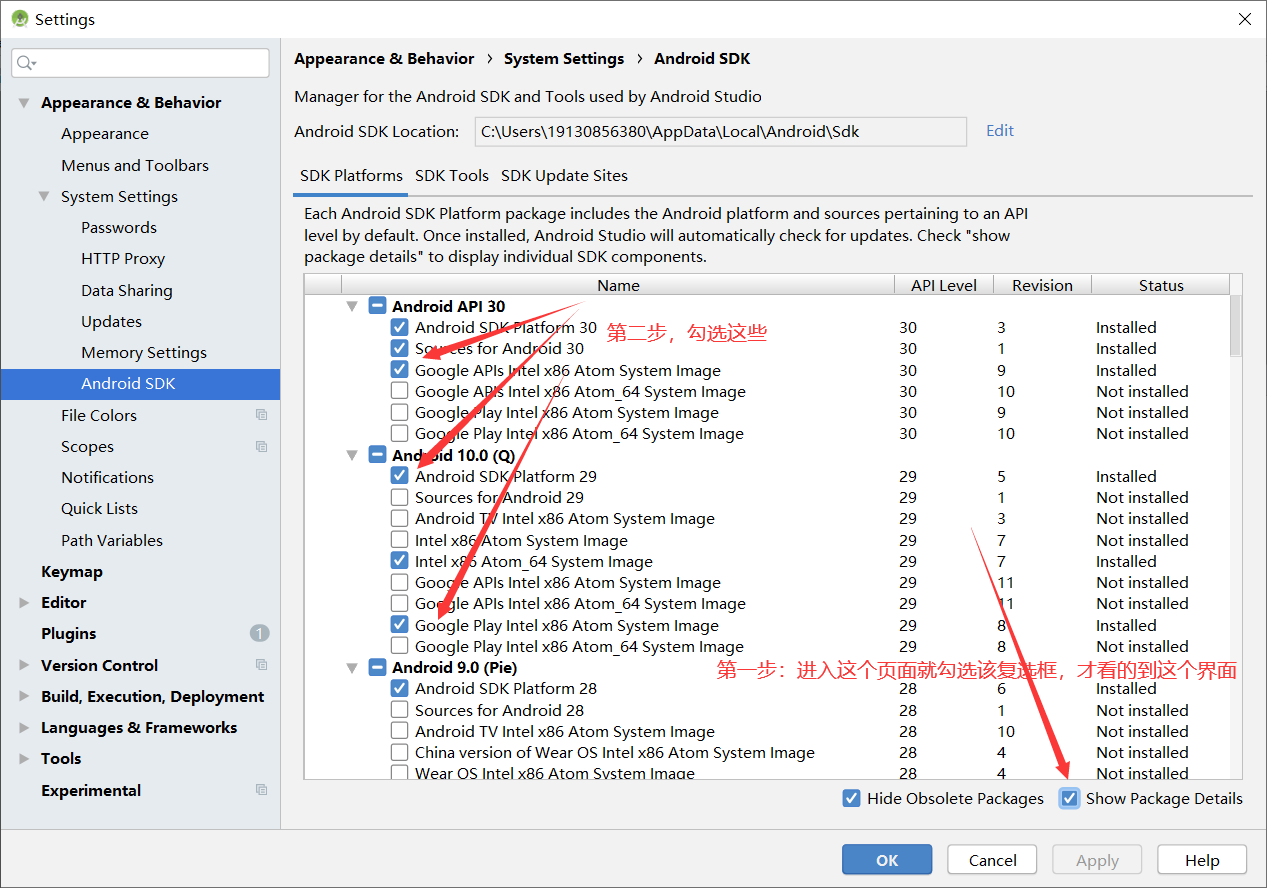 安装Android SDK(必须选对版本):Android Studio 默认会安装最新版本的 Android SDK。目前编译 React Native 应用需要的是Android 10 (Q)版本的 SDK(注意 SDK 版本不等于终端系统版本,RN 目前支持 android 4.1 以上设备)。你可以在 Android Studio 的 SDK Manager 中选择安装各版本的 SDK。