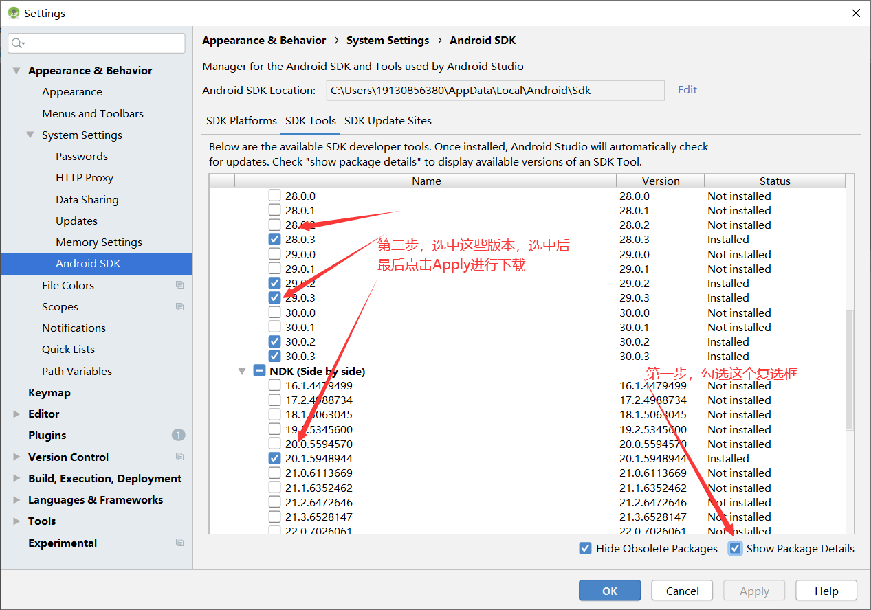 核对完选项后,点击Apply进行下载,下载完毕之后配置android环境变量.如下图: