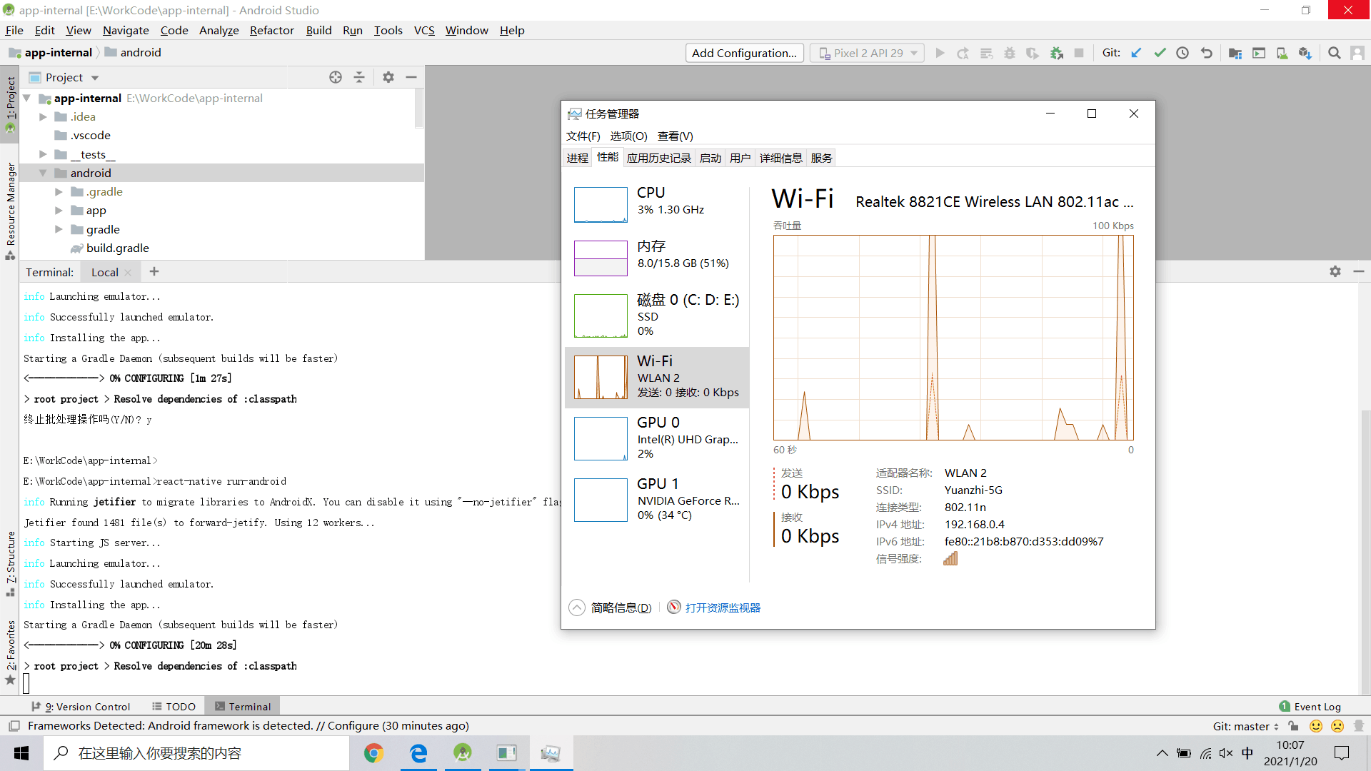 二:从公司拉取下来的项目,运行并没有报错,而是一直卡在0%不动,那么是因为下载外网依赖太慢,或者无法翻墙,可以通过拷贝其他电脑已经下载好的.gradle文件即可运行。卡顿情况如下第二张图: