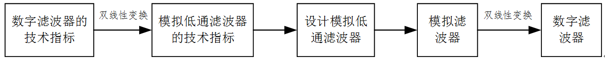 数字滤波器设计常采用间接设计法,即先将给定的数字滤波器技术指标转变为模拟滤波器低通滤波器的技术指标,然后将设计好的低通模拟滤波器转变为所需的数字滤波器,主要原因是模拟滤波器的设计方法比较成熟。从模拟滤波器到数字滤波器的设计方法有冲激响应不变法和双线性变换法等,以双线性变换法应用最广泛。用双线性变换法设计IIR数字滤波器的步骤如图2所示。