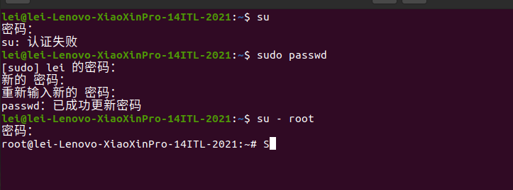 可以用sudo passwd命令,此时要求是输入普通用户的密码,输入root用户的新密码再切换即可
