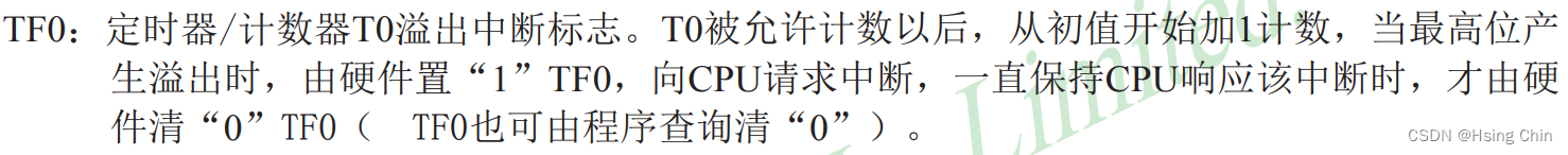 当从初始值经过不断+1后,到达最大值(也就是16bit值储存器的最大容量0xFF)后 ,会产生进位(溢出),会被TF0检测到,一旦检测到,TF0就会自动置1。