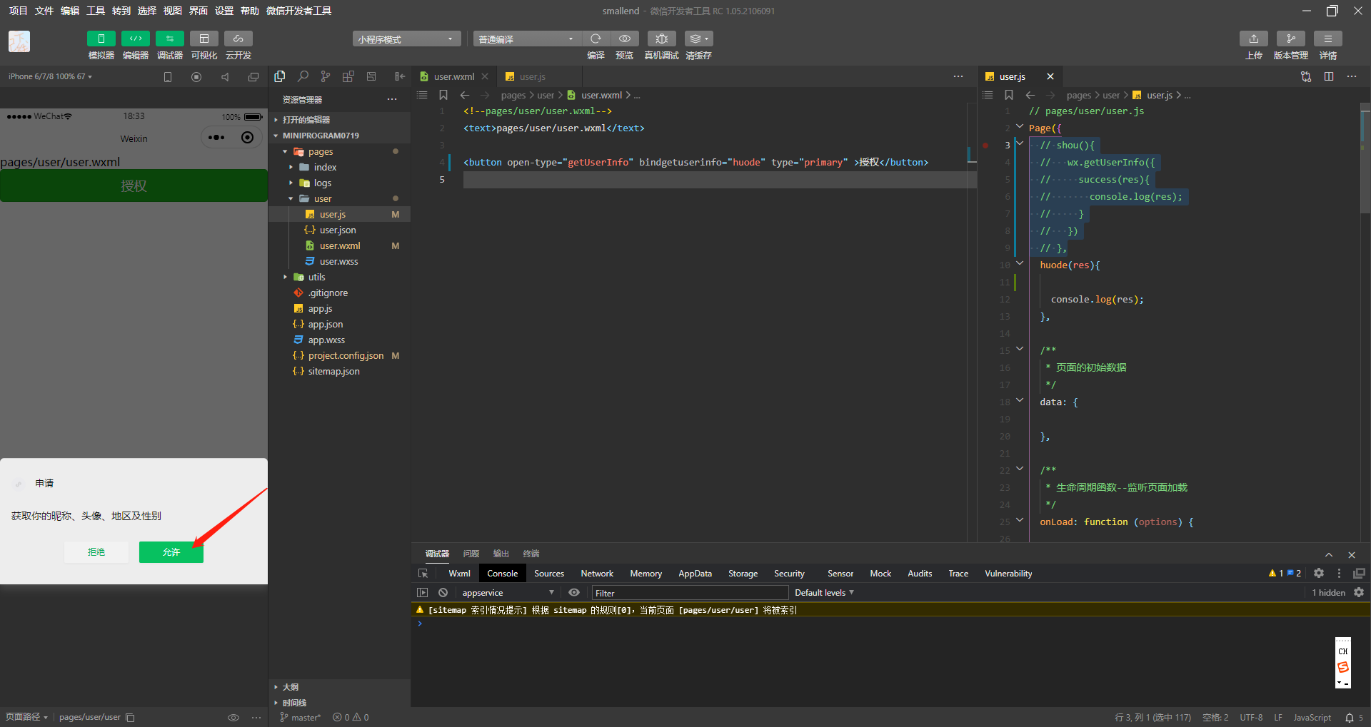 <button open-type="getUserInfo" bindgetuserinfo="huode" type="primary" >授权</button>2.在js文件中