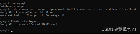 update user set password=password('521') where user='root' and host='localhost'; # 改密码