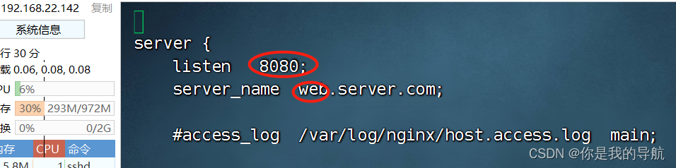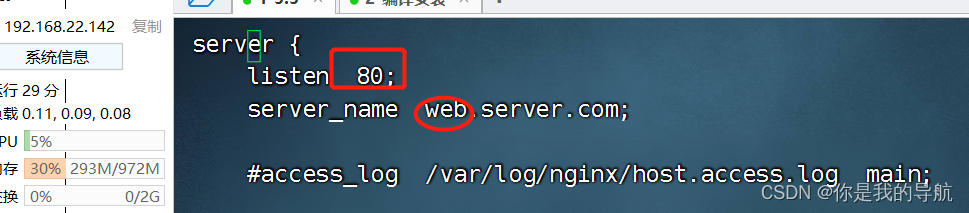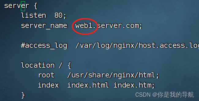 刚才主配置文件没server,它把server放到这里了,每一个server就是一台独立的虚拟主机,里面的是默认的,再去复制一个。复制之前,先把默认server的域名改了,改成web1.server.com