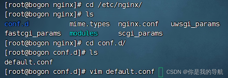 找它的配置文件,配置文件都会在/etc/nginx/下面,里面有个nginx.conf,这是它的主配置文件,