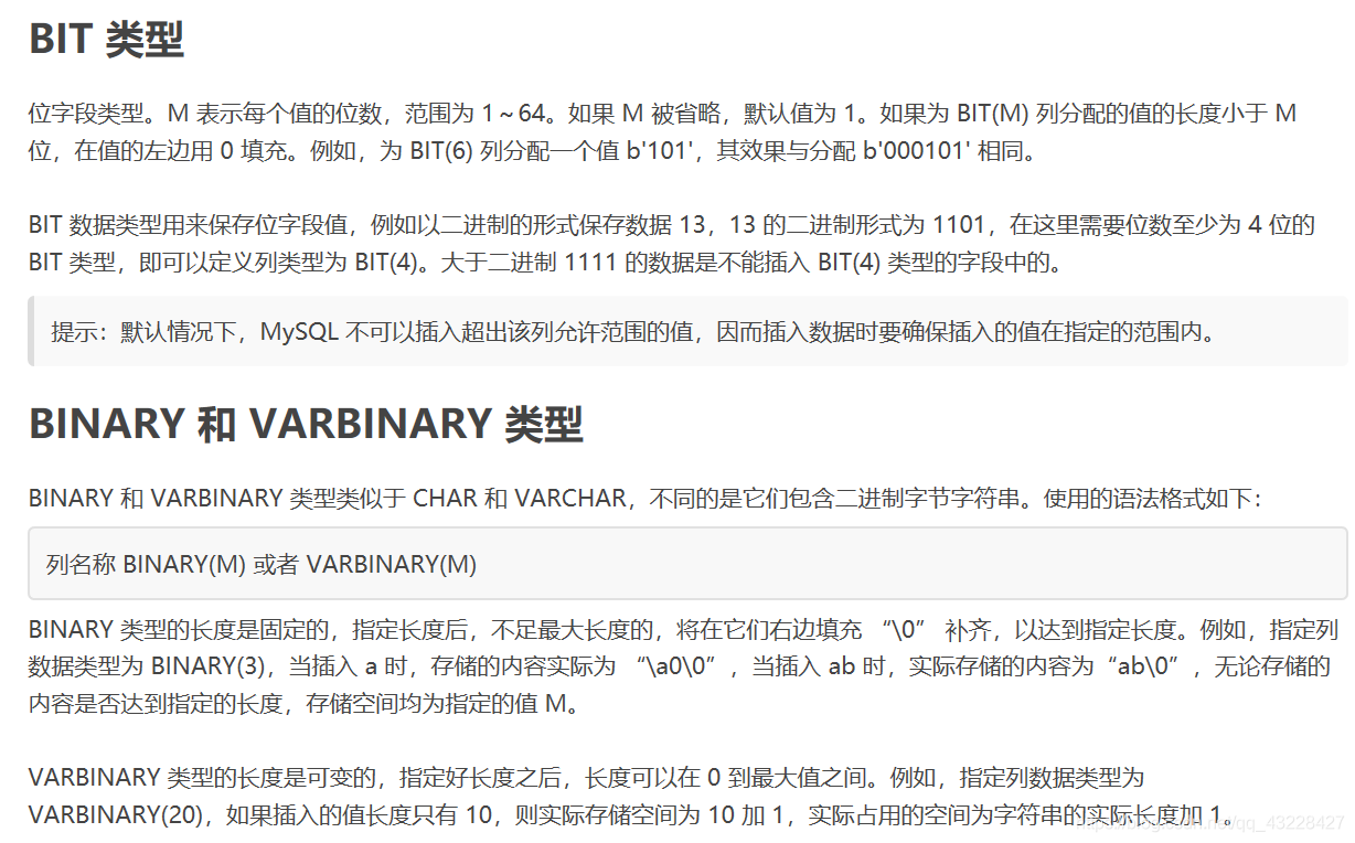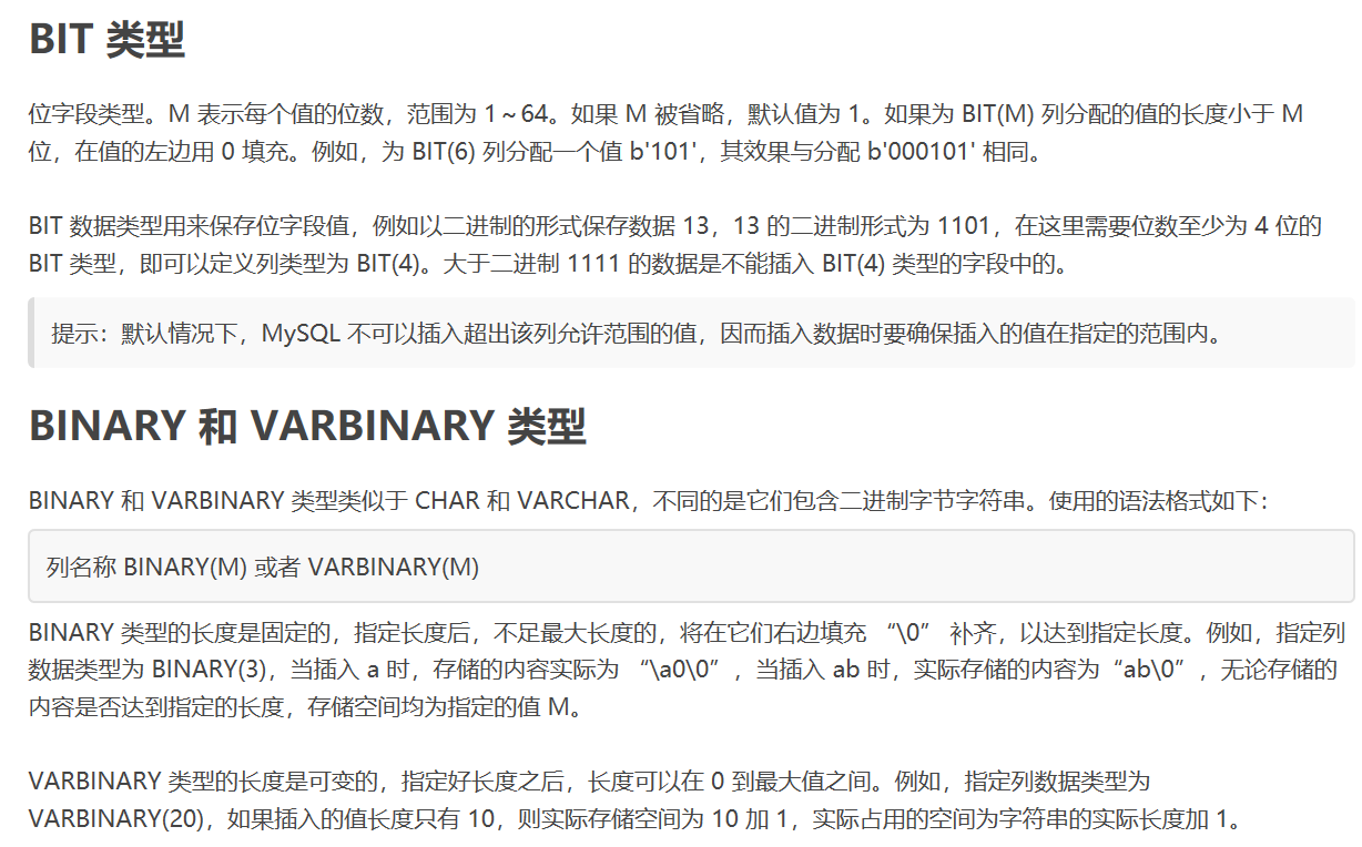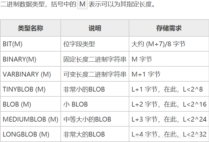 包括 BIT、BINARY、VARBINARY、TINYBLOB、BLOB、MEDIUMBLOB 和 LONGBLOB。