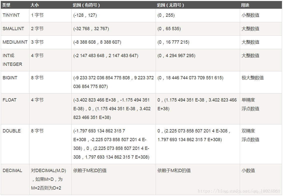 整数类型包括 TINYINT、SMALLINT、MEDIUMINT、INT、BIGINT,浮点数类型包括 FLOAT 和 DOUBLE,定点数类型为 DECIMAL。