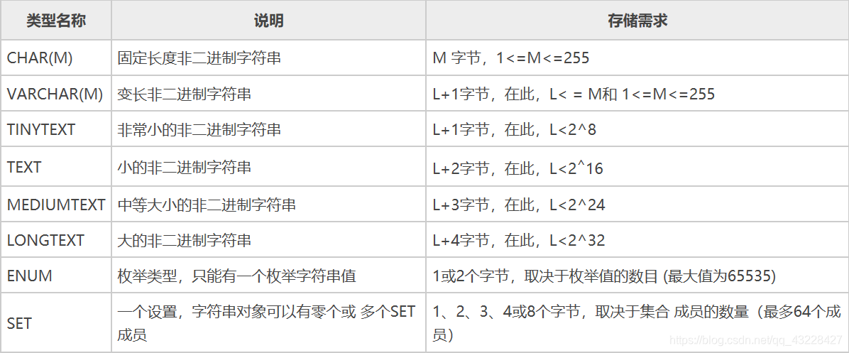 包括 CHAR、VARCHAR、BINARY、VARBINARY、BLOB、TEXT、ENUM 和 SET 等。
