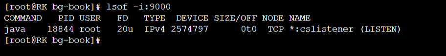 完成启动后,因为我这个项目是用的9000这个端口,如果不放心,项目是否正常启动,可以查看9000端口是否工作:lsof -:端口号