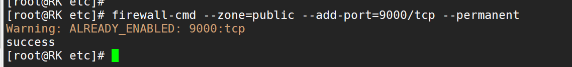 开端口命令:firewall-cmd --zone=public --add-port=9000/tcp --permanent