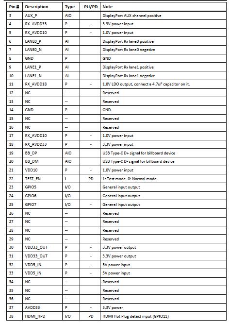 DP接口包括2条主通道、辅助通道和HPD信号。接收器支持每通道最大5.4Gbps(HBR2)数据速率。DP接收机结合了HDCP1.4和HDCP2.3内容保护方案具有嵌入式密钥,用于数字音视频内容的安全传输。