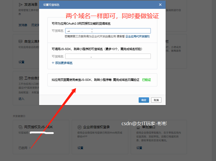 2 点击网页授权及js-sdk设置可信域名(设置好的就显示"已启用")
