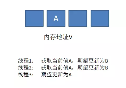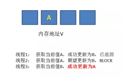 这个过程中,线程2获取到的变量值A是一个旧值,尽管和当前的实际值相同,但内存地址V中的变量已经经历了A->B->A的改变。