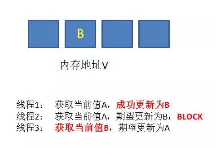 ⑤. 最后,线程2终于恢复了运行状态,由于阻塞之前已经获得了“当前值”A,并且经过compare检测,内存地址V中的实际值也是A,所以成功把变量值A更 新成了B。
