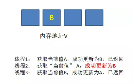 ③. 接下来,线程1先一步执行成功,把当前值成功从A更新为B;同时线程2因为某种原因被阻塞住,没有做更新操作;线程3在线程1更新之后,获得了当 前值B。