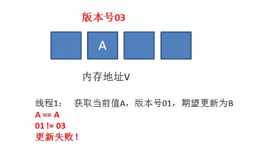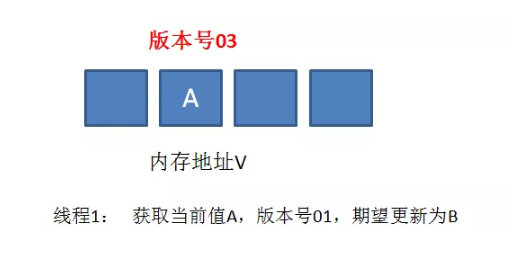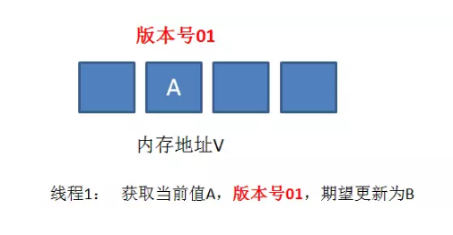 我们仍然以最初的例子来说明一下,假设地址V中存储着变量值A,当前版本号是01。线程1获得了当前值A和版本号01,想要更新为B,但是被阻塞 了。
