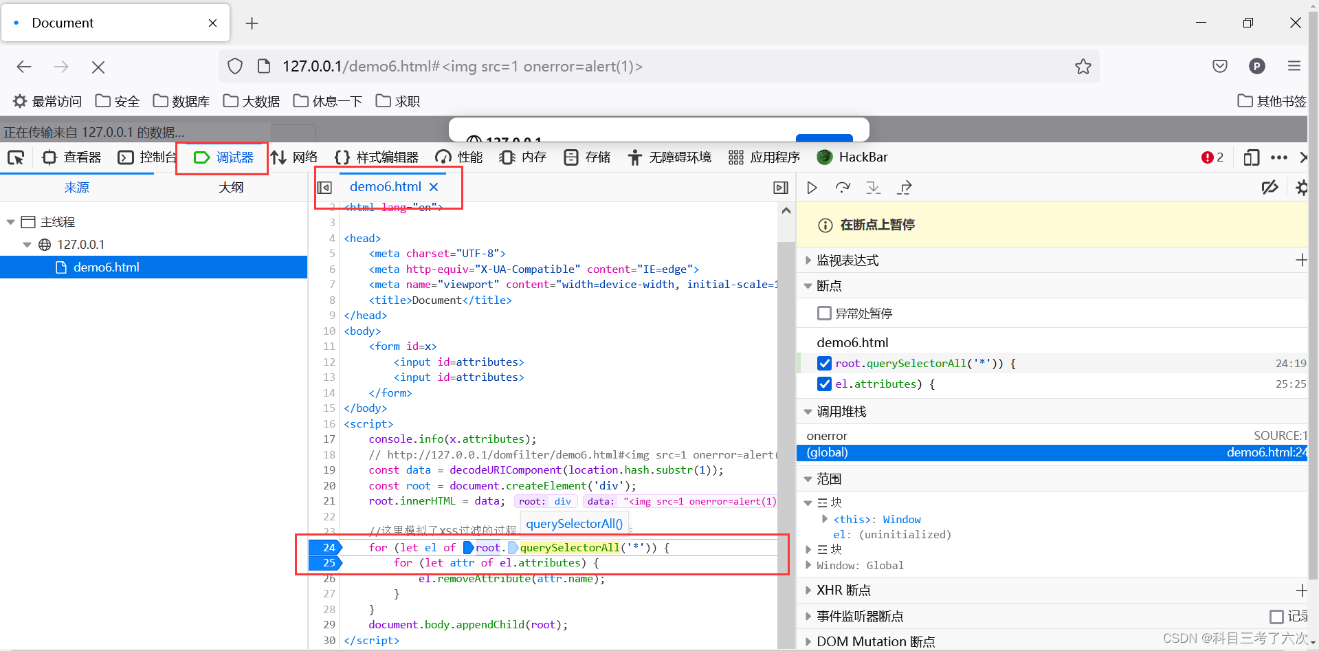 但是却发现src=1的属性被删除了,οnerrοr=alert(1)属性却还保留着,这是为什么呢?我们先了解一下这里的删除顺序。我们使用断点调试测试它的顺序