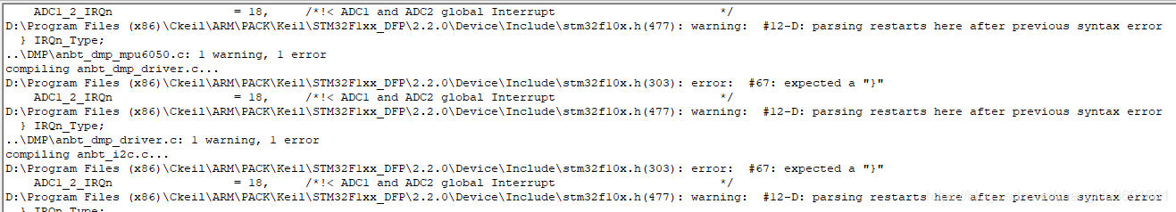 ... Keil\STM32Fxx_DFP\2.2.0\Device\Include\stm32f10x.h(303): error: #67: expected a "}"