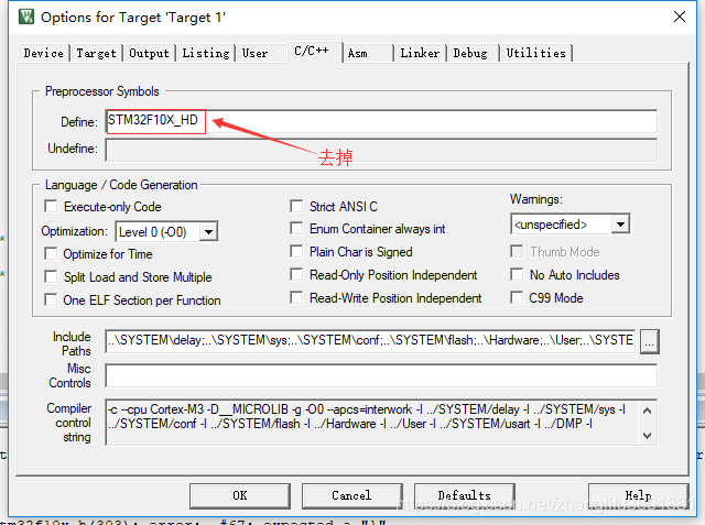 在工程属性中,c/c++ 选项中 把 Define 中关于MCU的定义去掉,如下图中的 STM32F10X_HD