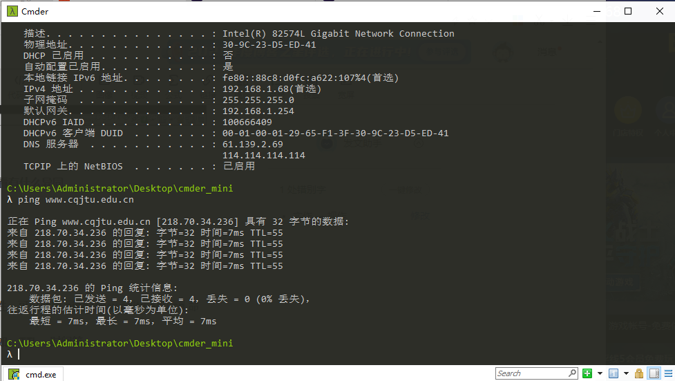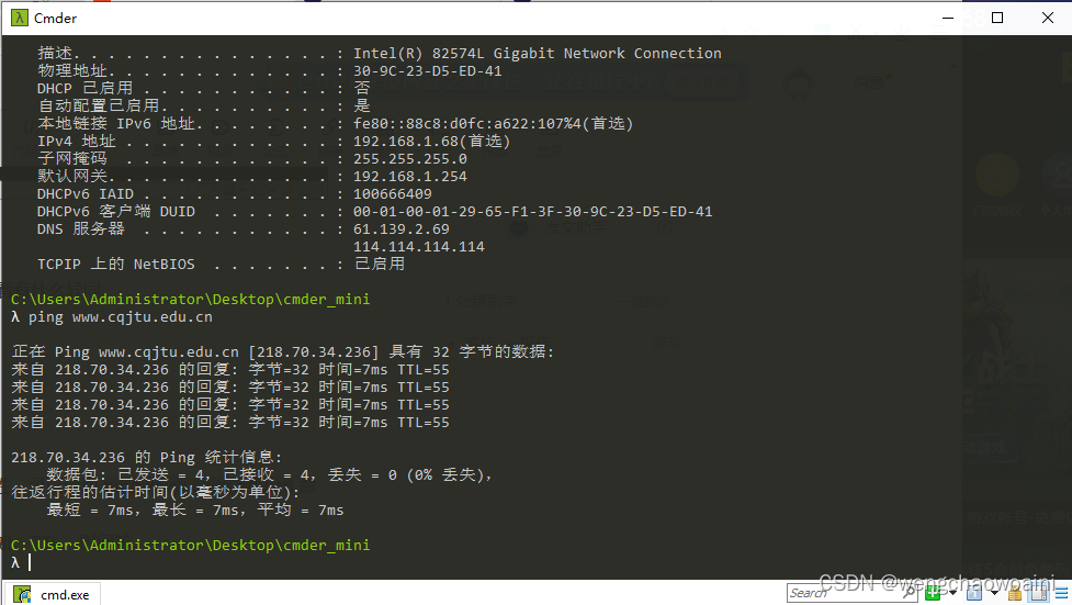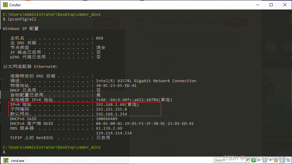 使用 ipconfig/all 查看自己计算机的网络配置,尽可能明白每行的意思,特别注意 IP 地址、子网掩码 Subnet Mask、网关 Gateway。