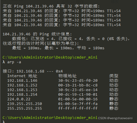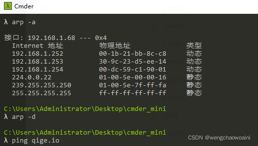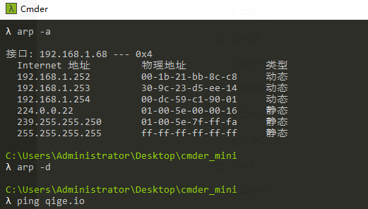 然后 ping 一下你旁边的计算机 IP(注意,需保证该计算机的 IP 没有出现在 arp 缓存中,或者使用 arp -d * 先删除全部缓存),再次查看缓存,你会发现一些改变,请作出解释。