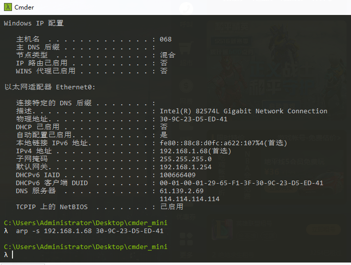 假设当前网关的 IP 地址是 192.168.0.1,MAC 地址是 5c-d9-98-f1-89-64,请使用 arp -s 192.168.0.1 5c-d9-98-f1-89-64 命令设置其为静态类型的。