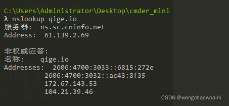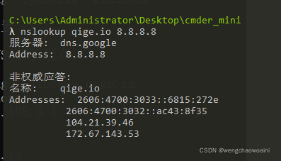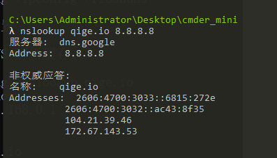 使用 nslookup qige.io 命令,将使用默认的 DNS 服务器查询该域名。当然你也可以指定使用 CloudFlare(1.1.1.1)或 Google(8.8.8.8) 的全球 DNS 服务器来解析,如:nslookup qige.io 8.8.8.8,当然,由于你懂的原因,这不一定会得到正确的答案。