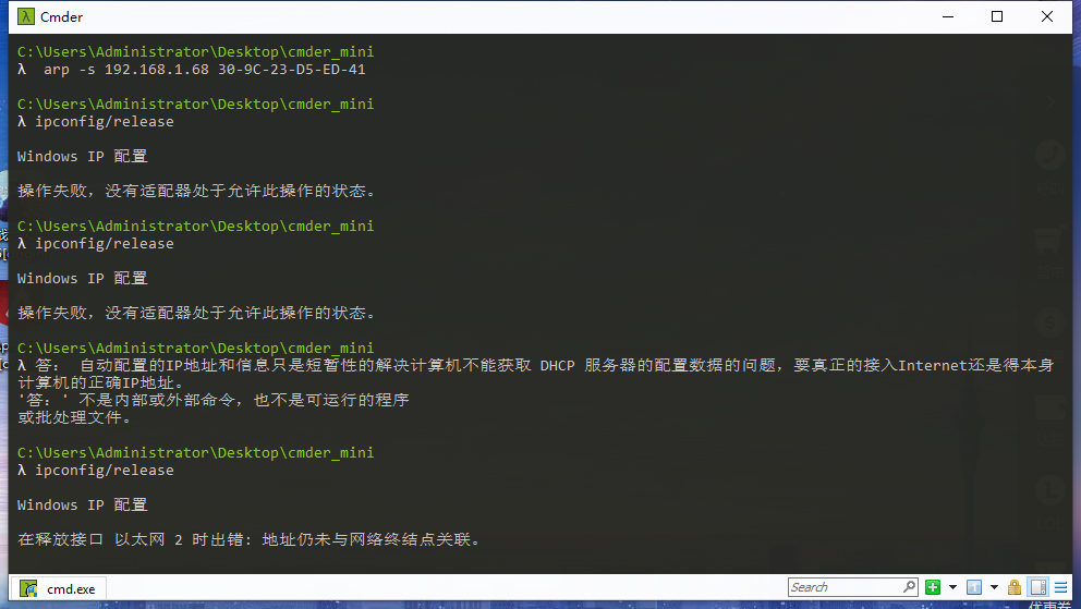 你可能会在实作三的操作中得到 “ARP 项添加失败: 请求的操作需要提升” 这样的信息,表示命令没能执行成功,你该如何解决?