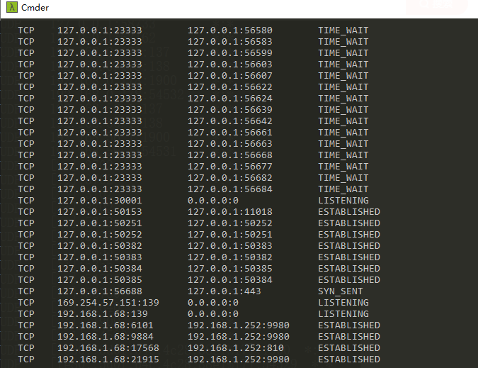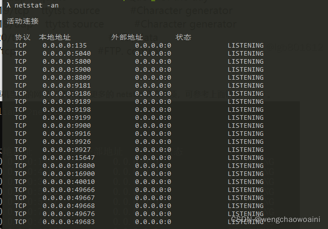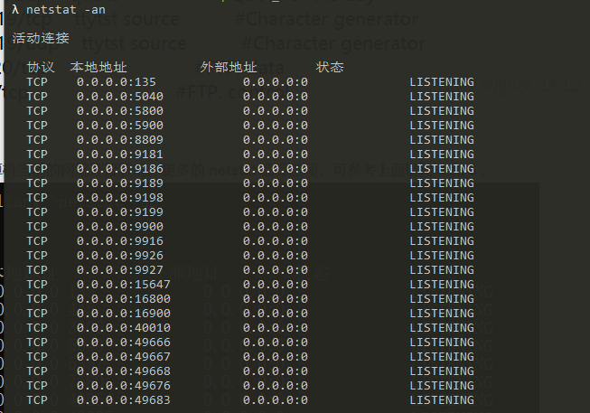 使用 netstat -an 命令,查看计算机当前的网络连接状况。更多的 netstat 命令选项