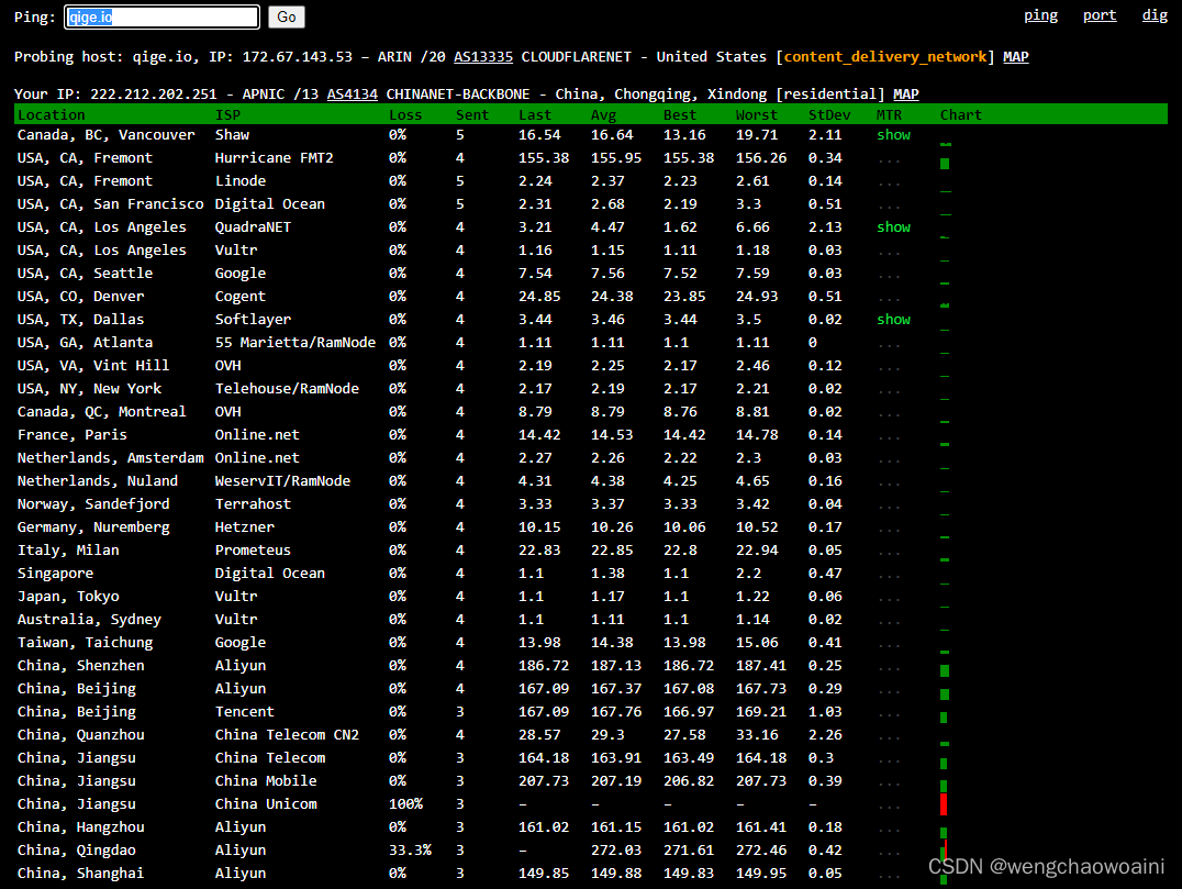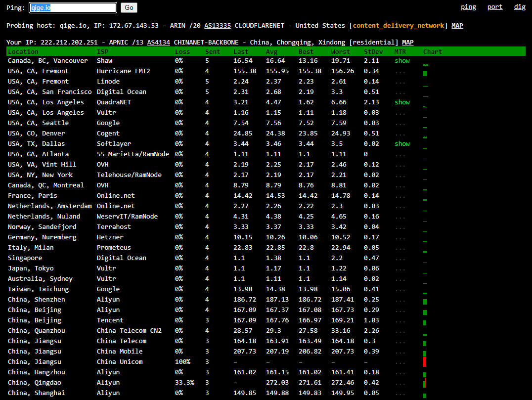 ping.pe 这个网站可以探测从全球主要的 ISP 到某站点如 https://qige.io 的线路状态,当然也包括各线路到该主机的路由情况。请使用浏览器访问 http://ping.pe/qige.io 进行了解。