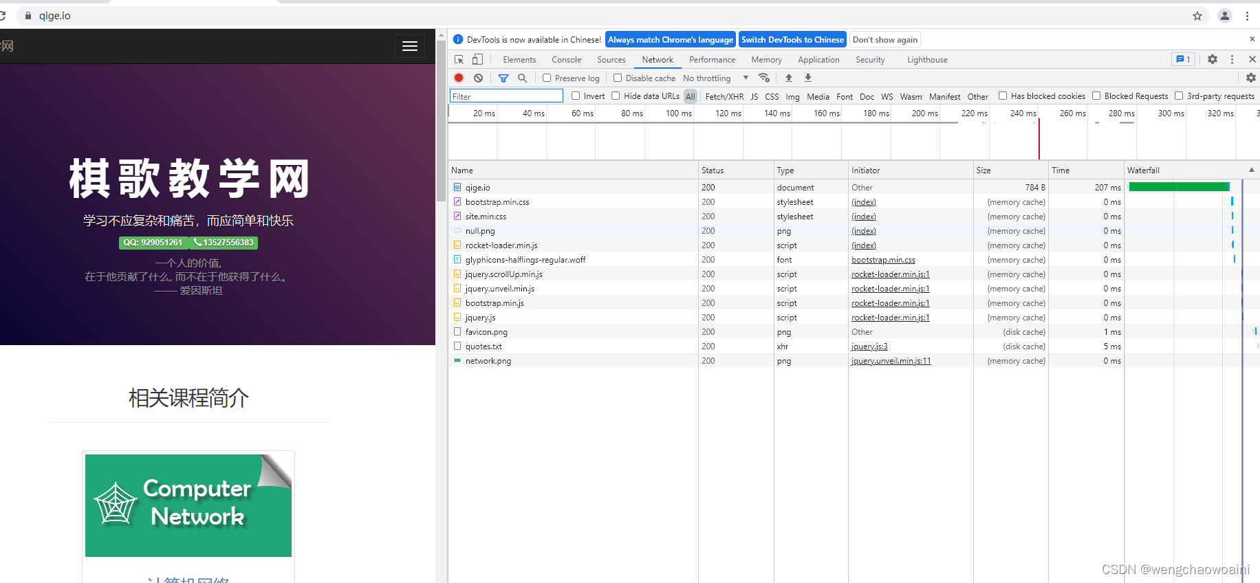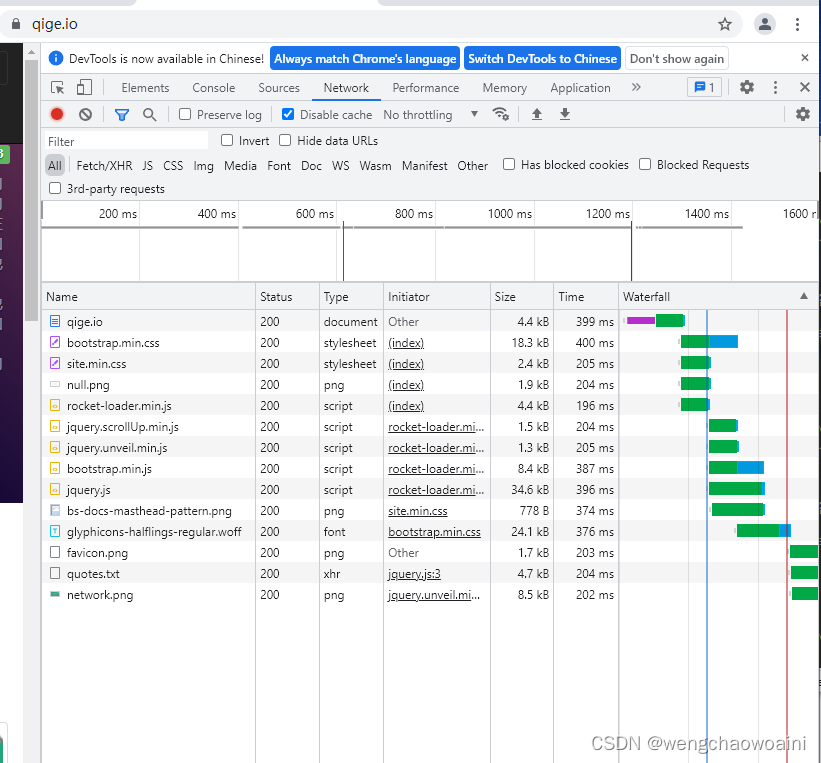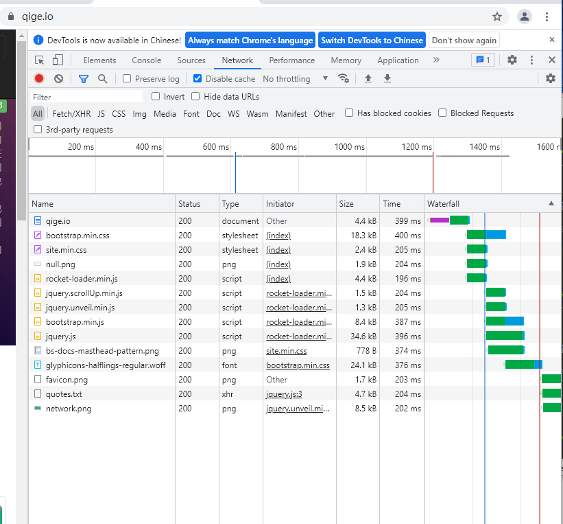 打开 Chrome 或 Firefox 浏览器,访问 https://qige.io ,接下来敲 F12 键 或 Ctrl + Shift + I 组合键打开开发者工具,选择 Network 面板后刷新页面,你会在开发者工具底部看到加载该页面花费的时间。请进一步查看哪些文件被 cache了,哪些没有。