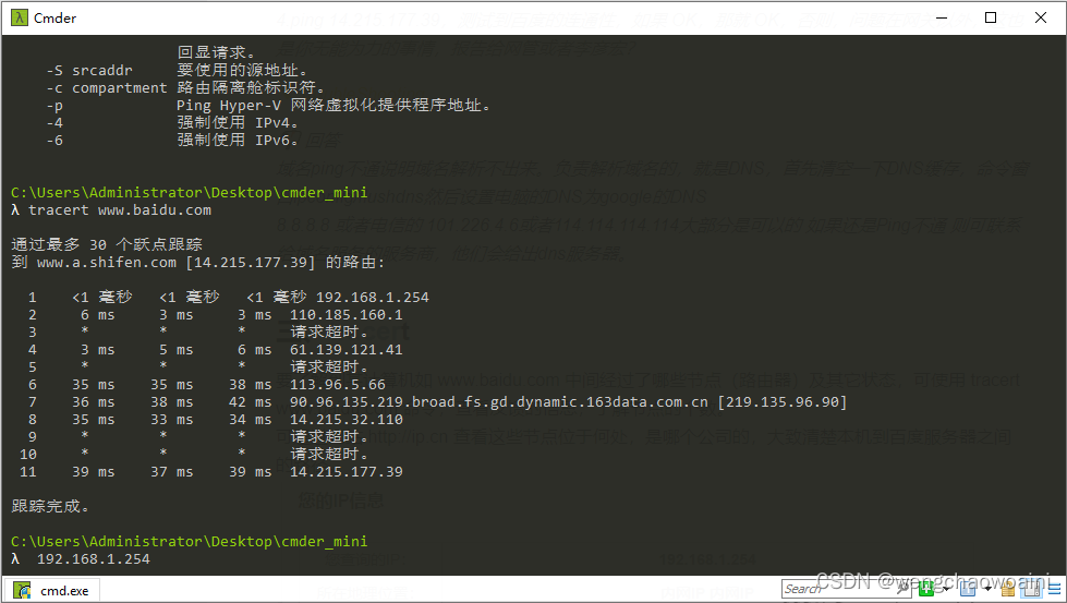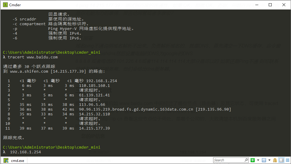 可通过网站 http://ip.cn 查看这些节点位于何处,是哪个公司的,大致清楚本机到百度服务器之间的路径。