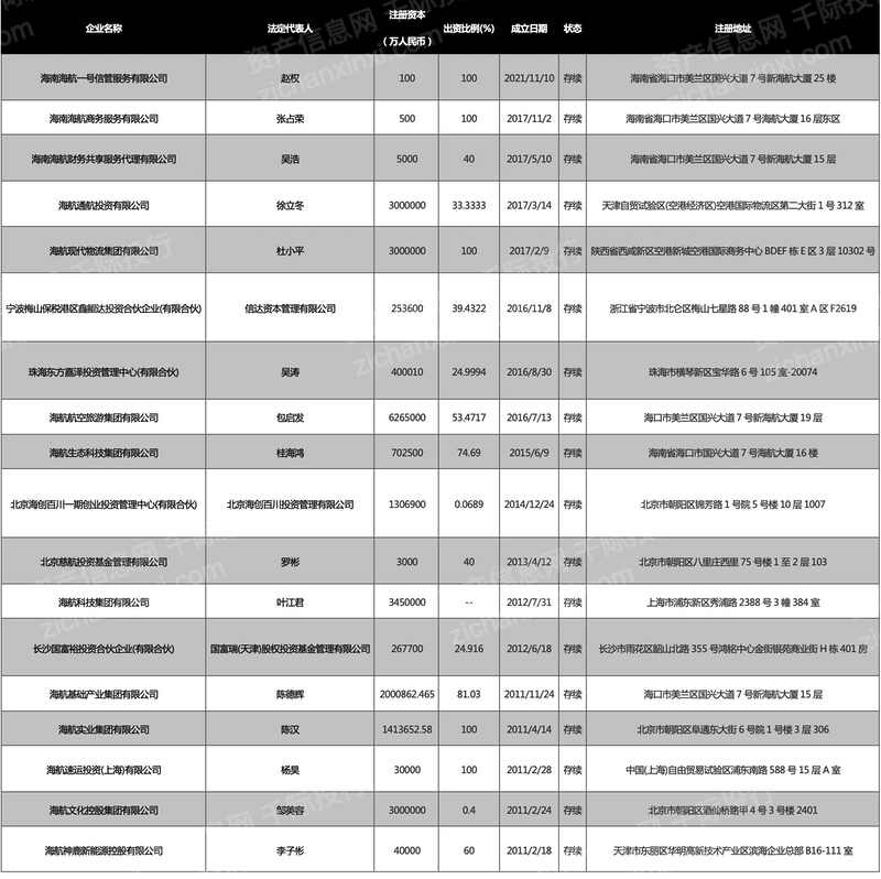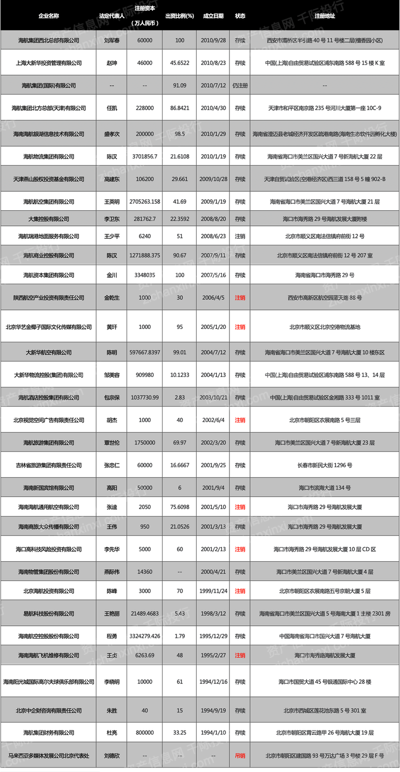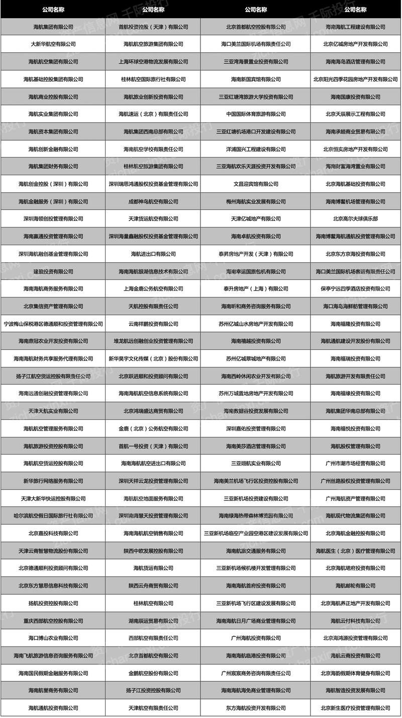 海航集团有限公司、大新华航空有限公司、海航航空集团有限公司、海航基础控股集团有限公司、海航资本集团有限公司、海航商业控股有限公司、海航实业集团有限公司