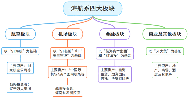 海航重整后将拆分为四个板块独立运营,分为航空板块、机场板块、金融板块、商业及其他板块,各自由新的实控人股东带领前行,相互完全独立,确保各板块各自回归主业、健康发展。